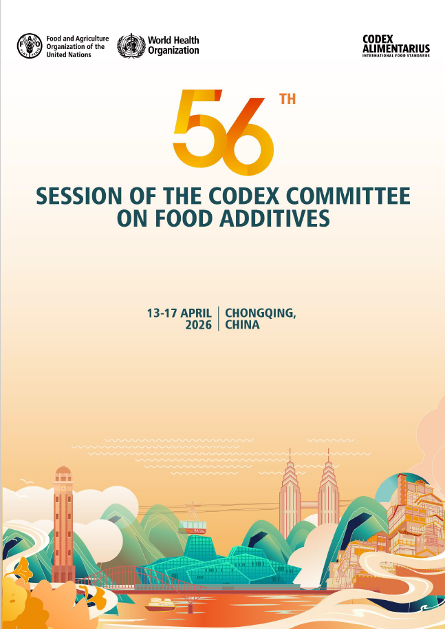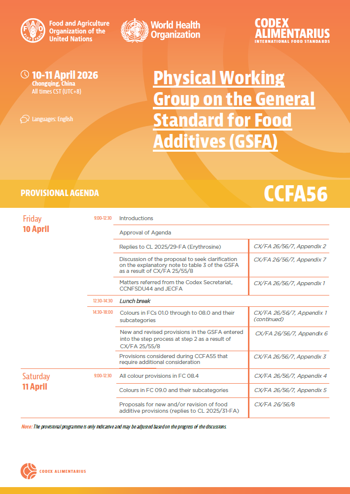 GENERAL INFORMATION The 56th Session of the Codex Committee on Food Additives (CCFA56) has been scheduled to take place in Chongqing, China from 13 - 17 April 2026. Physical working groups (PWGs) will take place on 10 and 11 April 2026 (see details below). The plenary sessions of CCFA56 and the PWGs will be webcast live in Chinese, English, French, and Spanish. PHYSICAL WORKING GROUPS (PWGs) The following sessions are planned (English only): Provisional Agenda