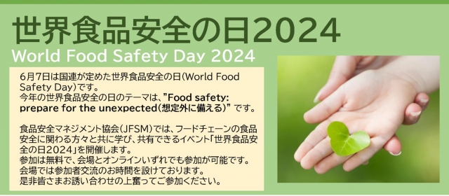 The Food Safety Management Association (JFSM) will be hosting an event titled "World Food Safety Day 2024" where individuals involved in food safety across the food chain can learn and share together. Participation is free, and attendees can join either in person or online. Additionally, there will be dedicated time for participant networking at the venue. We encourage everyone to participate enthusiastically and invite others to join as well.