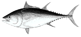 Autres noms scientifiques encore en usage: Thunnus thynnus (Linnaeus, 1758) Noms vernaculaires FAO: An - Northern bluefin tuna; Es - Atún; Fr - Thon rouge. Caractères distinctifs: Très grande espèce au corps fusiforme de section subcirculaire, très robuste à l'avant; 34 à 43 branchiospines sur le premier arc branchial. Deux nageoires dorsales séparées seulement par un intervalle étroit, la seconde plus haute que la première; 8 à 10 pinnules présentes derrière la seconde dorsale et 7 à 9 derrière l'anale; pectorales très courtes (moins de 23% de la longueur à la fourche et moins de 80% de la longueur de la tête) n'atteignant jamais l'intervalle séparant les dorsales; appendice bifide (processus interpelvien) entre les nageoires pelviennes; très petites écailles sur le corps, un corselet d'écailles plus grandes bien développé. Pédoncule caudal mince avec une forte carène médiane entre 2 petites carènes latérales situées à la base de la a caudale. Coloration: dos bleu plus ou moins foncé, flancs et ventre blanc argenté avec des lignes transversales incolores alternant avec des rangées de points incolores (ces derniers dominent chez les individus les plus âgés), visibles seulement sur les spécimens frais; première dorsale jaune ou bleuâtre, seconde dorsale brun rougeâtre; anale et pinnules jaunâtres bordées de noir; carène latérale noire chez les adultes. Taille: Maximum longueur à la fourche plus de 300 cm; commune de 50 à 150 cm. Habitat et biologie: Epi-et mésopélagique, très bon nageur pouvant effectuer des migrations transocéaniques. Les jeunes, grégaires, se mêlent en banc à d'autres Scombroides de même taille. Les immatures se tiennent en eaux chaudes, les adultes pénètrent en eaux froides pour se nourrir. Reproduction de mai à juillet à 8-10 m de profondeur surtout autour des îles Baléares et entre la Sardaigne, l'Italie et la Sicile. Maturité sexuelle à 3 ans (environ 90 cm). Prédateur vorace qui chasse de nombreuses espèces de poissons, crustacés et céphalopodes. Pêche et utilisation: Pêche semi-industrielle (Espagne, mer Tyrrhénienne, Adriatique, Sicile et Maroc), artisanale et sportive. Enginssennes de plage et coulissantes, chaluts et filets maillants pélagiques, lignes à main et lignes de traîne, palangres dérivantes, barrages. Régulièrement présent sur les marchés de Méditerranée occidentale et de Grèce, occasionnellement à rarement ailleurs, est commercialisé frais, réfrigéré, congelé, fumé ou en conserves. |