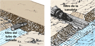 filtros para el tubo de entrada, el desagüe y el aliviadero,