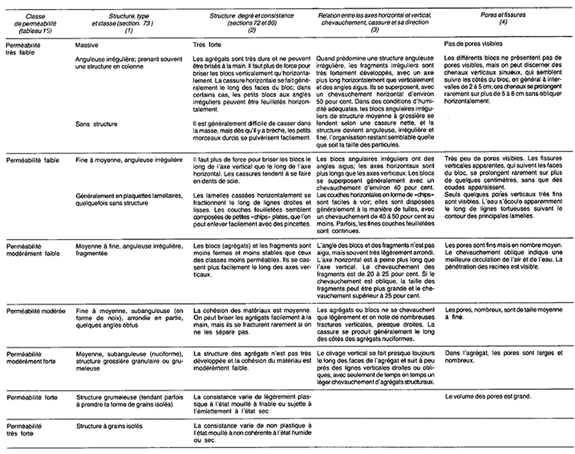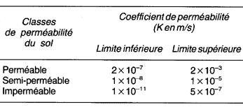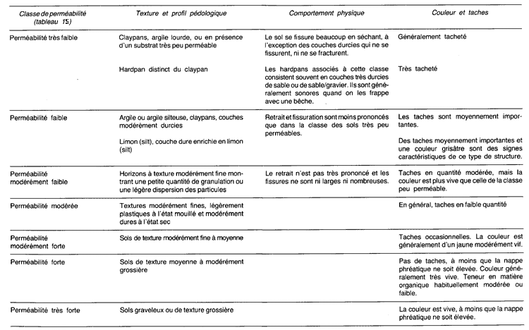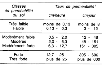 Pour les besoins de l'agriculture et de la conservation des terres, les classes de perméabilité des sols sont basées sur les taux de perméabilité. Pour les travaux de génie civil, elles sont basées sur le coefficient de perméabilité (voir tableaux 15 et 16).