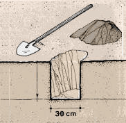 Note. En construisant votre étang, vous n'avez pas nécessairement besoin d'enlever une couche perméable peu profonde, si elle recouvre une autre couche non perméable et capable de retenir l'eau. Il vous faut, cependant, descendre jusqu'à la couche imperméable plus profonde pour construire les digues de l'étang, afin d'obtenir un bassin bien fermé et d'éviter les infiltrations horizontales (voir section 90).