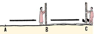 8. The rear person places one end-staff on the marked starting point A and keeps the cord on the 1 m graduation, for example. The front person, also keeping the cord on the same graduation, moves the second end- staff up or down the slope until the centre person signals that the mason's level is horizontal. The front person then marks the point B where the staff touches the ground. 9. The rear person walks to this marked point B while the other two people walk ahead until the cords are well stretched. The entire procedure is repeated and another point C of the contour line is marked. |