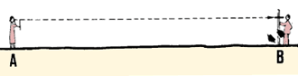 | 3. Your assistant, holding the levelling staff vertically, should stand about 10 to 15 m away from the starting point A of the contour line you want to plot. From this starting point, use the clinometer to sight at the levelling staff. Signal to your assistant to move the staff up or down the slope, until its target lines up with the zero-graduation of your clinometer. Have your assistant mark this ground point B and repeat the same procedure from it |