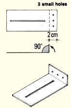 27. On each metal piece, use a nail to draw a fairly deep line perpendicular to the centre-line, at a point 2 cm from the end without a slit or window. Then make three small holes parallel to this line and between the line and the end of the piece, using a hammer and nail. Sharply bend this end of the metal along the deep line, until it forms a right angle with the rest of the piece. |