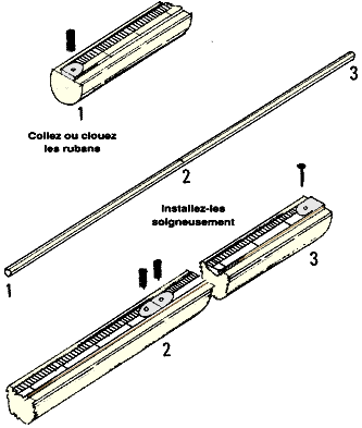 4. Il faut maintenant y ajouter des graduations. Les graduations sont des traits indiquant des mesures exactes en centimètres, décimètres, mètres, etc. A cet effet, vous devez vous procurer deux rubans gradués prêts à l'emploi, tels que les rubans gradués de 2 m de long utilisés par les tailleurs. Collez un ruban de ce type à la surface rabotée de votre morceau de bois. Prenez soin de bien aligner le zéro du ruban avec l'une des extrémités de la perche. Collez le deuxième ruban gradué à proximité de l'extrémité du premier; vous devez ainsi atteindre pratiquement l'extrémité de la perche. Enfoncez plusieurs petits clous à large tête dans les rubans pour mieux les fixer.