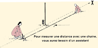 6. On utilise la chaîne d'arpenteur pour mesurer la longueur des lignes droites, dont chaque extrémité doit être marquée par un piquet de repérage. Vous aurez besoin du concours d'un assistant. La méthode de chaînage à appliquer dépendra du type de terrain (voir section 2.6).