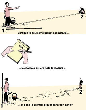 9. Le chaîneur arrière note immédiatement cette mesure. 10. Le chaîneur arrière enlève ensuite le premier piquet de repérage, le pose dans son panier et plante de nouveau le jalon au point de départ. |