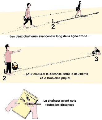 d'arpentage, les deux chaineurs avancent le long de la ligne droite, en