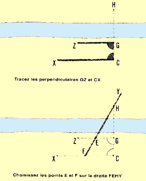 5. Dans ce cas, l'obstacle (cours d'eau) ne peut être évité, mais les points dont l'éloignement doit être mesuré sont visibles des deux côtés du cours d'eau. Plusieurs méthodes géométriques sont alors applicables. Deux d'entre elles sont décrites ci-après. 6. Supposons qu'il faille mesurer la distance GH tracée de part et d'autre d'un cours d'eau. Au moyen de jalons, prolongez la droite GH en arrière jusqu'au point C. Des points G et C, élevez les perpendiculaires GZ et CX. Sur chacune de ces droites, implantez les points E et F situés eux-mêmes sur une droite FY passant par le point H, sur l'autre rive. Mesurez les distances accessibles GE, GC et CF. Calculez ensuite la distance inaccessible GH par la formule suivante: GH = (GE x GC) ÷ (CF - GE) |
