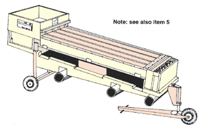 5. Fully mechanical graders are usually transported to the side of the pond and are frequently trailer-mounted. They are usually variable-width graders, with a sloping upper trough in which the fish are placed (or pumped), which is separated from two or more lower receiving boxes by the grader screen. These receiving boxes are usually connected by pipe, through which the fish return by gravity to their final locations. A continuous flow of water and fish enters the upper end of the trough where the screen width is narrow. Smallest size fish drop through in the first receiving box. The fish move progressively down the trough until the widening screen allows them to drop through into their appropriate size group.