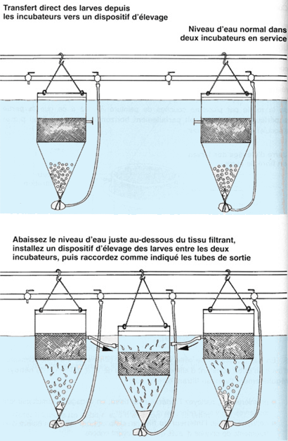 10. Dans le cas de certains poissons, par exemple les carpes chinoises, il est possible de transférer automatiquement les larves récemment écloses directement dans un dispositif d'élevage, par la technique dite du "swimming out",. A cet effet, Il est possible d'utiliser trois dispositifs à entonnoir en plastique et en tissu (voir section 9.3 et ci-dessus), placés dans un récipient rempli d'eau. Sitôt l'éclosion commencée, procédez comme suit: