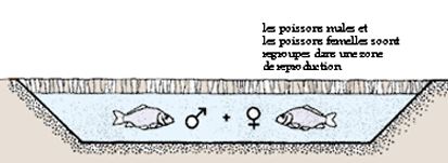 Empoissonnement de la frayère2. Il est toujours préférable d'introduire un plus grand nombre de mâles (M) que de femelles (F) dans la frayère, par exemple (1 F / 2 ou 3 M) ou ( 2 F / 3 M) ou (3 F / 4 M), afin d'assurer une reproduction efficace 3. Le nombre total de géniteurs à placer dans la frayère dépend des dimensions de celle-ci et de la taille des géniteurs. Exemple Une frayère de 2 m2 de surface peut recevoir une population de géniteurs de carpes communes constituée comme suit: