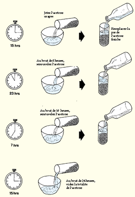 (c) A peu près toutes les 8 heures, renouvelez le bain d'acétone au cours d'une période d'une durée totale de 24 heures. Ensuite, videz entièrement l'acétone.