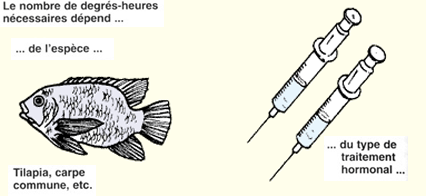 Le lendemain matin à 6 h, le nombre total de degrés-heures devrait atteindre 239,6º, ce qui est très proche du nombre nécessaire dans ce cas particulier, soit 240 à 260º. Il faut alors commencer à surveiller attentivement les poissons. 22. Le nombre de degrés-heures prescrit dépend: