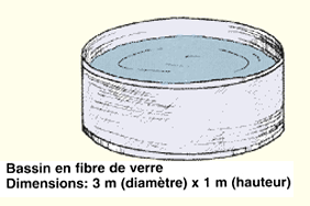 (d) Des petits bassins sont également utilisables pour les larves actives; ils sont généralement de forme circulaire ou carrée à angles arrondis, construits en plastique renforcé de fibres de verre, en tôle ondulée, ou encore formés d'un châssis de bois ou de métal couvert à l'intérieur de PVC renforcé ou de butyl. Ces bassins ont généralement de 1 à 4 m de diamètre et 80 cm de profondeur. La profondeur d'eau varie de 10 à 50 cm. Le débit est d'environ 1 à 2 I/min par kilogramme de larves. Chaque mètre cube peut contenir jusqu'à 5 kg de larves.