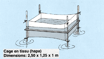 Enclos simples comme incubateurs9. Les enclos simples tels que les hapas et les caisses grillagées peuvent servir à incuber les oeufs adhésifs recueillis sur des kakabans (voir section 9.2). (a) Les hapas sont de préférence en tissu synthétique et ont des dimensions hors tout d'environ 2 m x 1 m x 1 m de hauteur. L'ouverture des mailles doit être suffisamment fine (environ 0,5 mm) pour empêcher les larves qui éclosent de s'échapper. La partie supérieure de la poche de tissu est montée sur de minces cordelettes. Les angles du haut et du bas sont fixés à des bambous ou à des piquets en bois solidement enfoncés dans le fond d'un plan d'eau peu profond. (b) Les caisses grillagées sont constituées d'un solide bâti en bois auquel du treillis métallique ou de la toile moustiquaire en matière plastique est fixée de façon à former un enclos cubique ou rectangulaire. Des supports sont placés sur les deux côtés de manière qu'on puisse disposer horizontalement un ou plusieurs kakabans; ces caisses sont placées dans un plan d'eau statique peu profond pendant la période d'incubation. 10. Il convient de couvrir l'enclos d'incubation, afin d'éviter l'action prédatrice des oiseaux et des grenouilles. 11. Il est préférable de transférer les kakabans garnis d'oeufs adhésifs pour les placer dans ces enclos d'incubation au cours de la première soirée après la ponte. Si la ponte a lieu de nuit, ce transfert peut s'effectuer de 8 à 10 heures après, à l'aube. Les distances de transport doivent être courtes et les kakabans doivent être recouverts d'un tissu humide. 12. Après l'éclosion des larves, retirez les kakabans des enclos d'incubation, nettoyez-les soigneusement et séchez-les. Il est possible de les réutiliser à plusieurs reprises. Note: L'incubateur représenté ci-contre est facilement transportable d'un endroit à l'autre puisque le cadre en bois et les piquets forment un ensemble. Ce cadre en bois n'est cependant pas toujours nécessaire, et il est possible de n'enfoncer dans le fond de l'étang que la série de piquets pour supporter l'enclos en filet (voir illustration ci-après).
