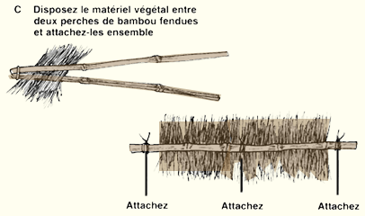 7. Avec les matériaux disponibles sur place, on peut également confectionner soi-même, à moindre frais, un type de collecteur particulier (appelé kakaban en Indonésie). Procédez comme suit. (a) Prenez des matières végétales fibreuses (environ 40 cm de long), telles que des feuilles de palmier, des petites branches de pin ou de longues herbes sèches. (b) Prenez des perches de bambou de 4 à 5 cm de diamètre et d'environ 1,20 m de long. Fendez-les en deux dans le sens de la longueur; faute de bambou, vous pouvez utiliser des piquets en bois. (c) Introduisez le matériel végétal dans les perches de bambou fendues. Fixez-le soigneusement en assemblant solidement les deux moitiés de tiges de bambou. 8. Ces collecteurs sont montés ensemble de façon à former une sorte de radeau que l'on peut installer légèrement au-dessus du fond de l'étang, au moyen de deux longues perches fixées à l'aide de piquets et de cordages. Les collecteurs d'oeufs peuvent aussi être posés sur un bâti léger constitué de piquets, à 20 ou 30 cm audessus du fond de l'étang. Il faut prévoir environ 5 m² de kakaban par kilogramme de géniteurs femelles.