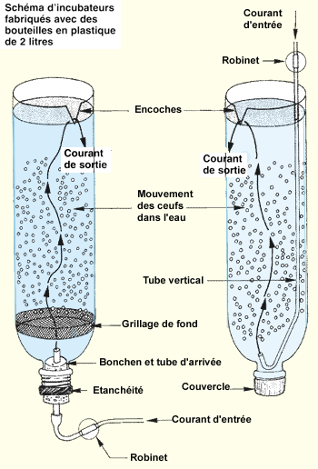 Seaux d'incubation17. Vous pouvez facilement réaliser ce type d'incubateur avec un récipient largement ouvert, par exemple une jarre en terre ou un seau en plastique. (a) Environ 5 cm au-dessus du fond, placez un tamis destiné à retenir les oeufs non adhésifs à l'intérieur du récipient. (b) Fixez à l'intérieur du couvercle du récipient une grille à mailles fines empêchant les larves écloses de s'échapper. (c) Dans l'axe du récipient, fixez un tube vertical (d'environ 1 cm de diamètre intérieur). Il doit dépasser légèrement le tamis du fond. Raccordez-le à sa partie supérieure à l'arrivée d'eau. 18. Les oeufs fécondés sont introduits dans le récipient. Le débit d'eau est réglé de façon que les oeufs restent en suspension et se déplacent très lentement pendant les deux premières phases de développement. Le débit d'eau est légèrement augmenté lorsque les oeufs atteignent le stade embryonné (apparition des yeux).