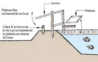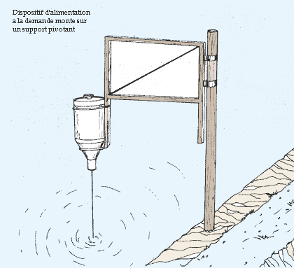 (k) Enfin, le distributeur d'aliments doit être fixé à un support adéquat. S'il doit être réalimenté et entretenu depuis une embarcation, le distributeur peut être boulonné à un poteau ou à une simple plate-forme en bois. Un support pivotant est particulièrement utile pour réaliser un accès latéral. A cet effet, Il faut installer solidement un poteau vertical, par exemple de 8 cm x 8 cm, dépassant de 1,50 m la surface de l'eau et muni d'un gros boulon ou d'une cheville à son extrémité. Fixez sur cette dernière une pièce transversale en bois de 2 à 3 m de long, de 5 à 8 cm de large et de 8 à 10 cm d'épaisseur, de façon qu'elle soit en équilibre sur le poteau vertical. Cette pièce transversale est munie d'une cornière en acier à une extrémité, à laquelle le distributeur d'aliments est fixé. Un contrepoids (par exemple de grosses pierres ou un bloc de béton) est fixé à l'autre extrémité. Soutenez, si nécessaire, le poteau vertical par des haubans,