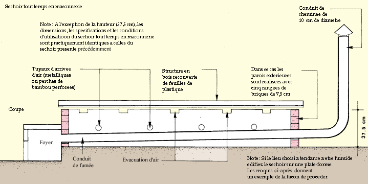 21. Le séchoir précédent fonctionne bien par temps ensoleillé. Si le séchage doit se poursuivre pendant de longues périodes de temps nuageux ou pluvieux, il y a parfois intérêt à construire un séchoir «tout temps» muni d'un système de chauffage. Il peut en outre servir de séchoir solaire par temps ensoleillé.