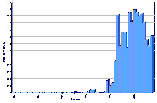 Production globale d’aquaculture de Rana catesbeiana (FAO Statistiques des pêches) ![]() |