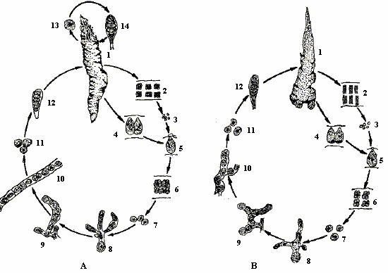 紫菜生活史图。-A=条斑紫菜。B=坛紫菜。 1 叶状体;2 性孢子器; 3 精子;4 果孢;5 受精卵;6 红海藻孢子囊;7 果孢子;8 壳斑藻丝状体; 9壳斑藻丝状体孢子囊分枝;10释放壳孢子;11 壳孢子; 12 幼叶状体;13 单孢子和幼叶状体。 |