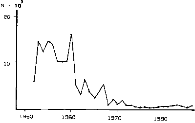 Fig.2. Annual catch (in numbers) in the Berlin area of the American crayfisch (Orconectes limosus Raff.) (Unpublished data by courtesy of dr. Ulrich Grosch)