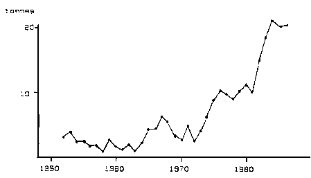 Fig. 3. Annual yield (in tonnes) of pikeperch (Stizostedion lucioperca) in the Berlin area (Unpublished data. by courtesy of dr. Ulrich Grosch, 1978)