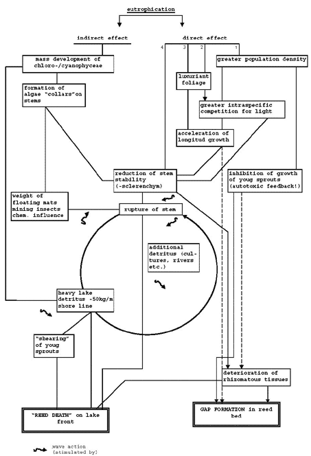 Increasing nutrient concentrations in the water enhances the growth of algae. Filamentous algae, especially Cladophora, form floating mats in which decaying (blue-green) phytoplanktonic algae are caught. These "carpets" become entangled; n the reed swamps at spec; al weather conditions. They fill up the space between bottom sediment and water surface. Wind induced wave action exercises severe stress on these carpets, so the reed will break. The remaining stems are filled with water and suffocate. Decaying stems also will become part of the mat, like all other kind of floating litter (Klotzli, 1971, 1973 & 1982; SchrBder, 1979; Sukopp & Markstein, 1981).