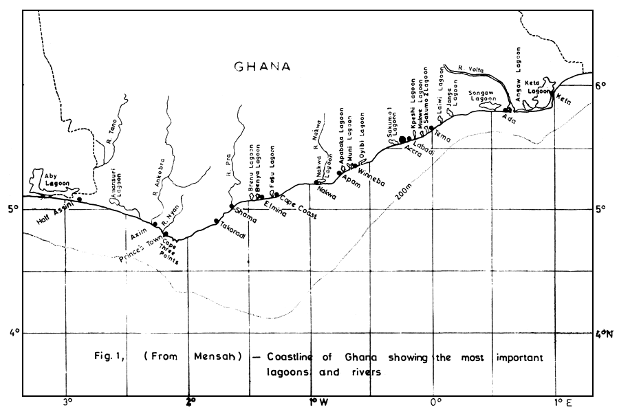 Several lagoons occur along the coast of Ghana, stretching from Half Assini in the west to Aflao in the east, a distance of approximately 550 km (Fig. 1). There are approximately 50 lagoons with a total surface area of about 40 000 ha, but most of them are small and unimportant in terms of fish production (Mensah, in press).