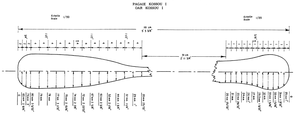 | Fig.203 On arrondira tous les côtés avec une lime à bois (un côté plat, un côté demi-rond) Fig.203 Round off all edges with a bastard wood rasp | Fig.205 Pagaie terminée Fig.205 Finished oar |