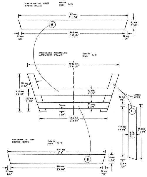 Fig.68 Dans du contreplaqué marin ou extérieur de 5 mm on découpera les gabarits A, B, C, selon le dessin “membrures”. Ceux-ci serviront à tracer les bois des membrures. A une extrémité d'un gabarit de traverse A ou B on percera des trous de 5 mm selon le dessin “trous de vis”, ce qui servira à marquer le perçage des vis.