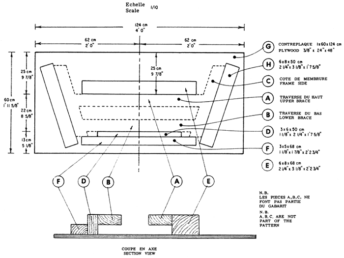 On préparera les bois H, E, D, F du dessin “gabarit de membrures” qu'on clouera au contreplaqué selon ce même dessin.
