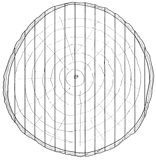 (e) Les grumes sont souvent coupées sur dosse ce qui résulte en un retrait tangentiel important pour toutes les planches autres que celles du centre de la grume. Ce retrait maximum est tangentiel aux cernes de croissance. Comme le retrait tangentiel est de 2 à 3 fois plus grand que le retrait radial (dessins au début du chapitre). Il est indispensable de choisir un bois qui ait peu de retrait afin de réduire les infiltrations d'eau entre les planches des pirogues.