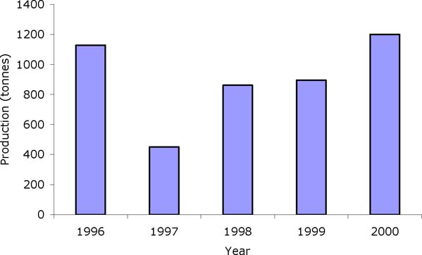 Aquafeed production is a nascent industry that only received attention after independence in 1960. Annual production figures reveal that there is a high degree of variation in the country's annual output - between 1996 and 2000, annual production has varied between 450 and 1 200 tonnes (Figure 1). During 2000, approximately 1 200 tonnes of aquaculture products, valued at US$1 562 000, were produced. This figure is significantly lower than the 238 467 tonnes of aquatic products that were imported into the country during this period.