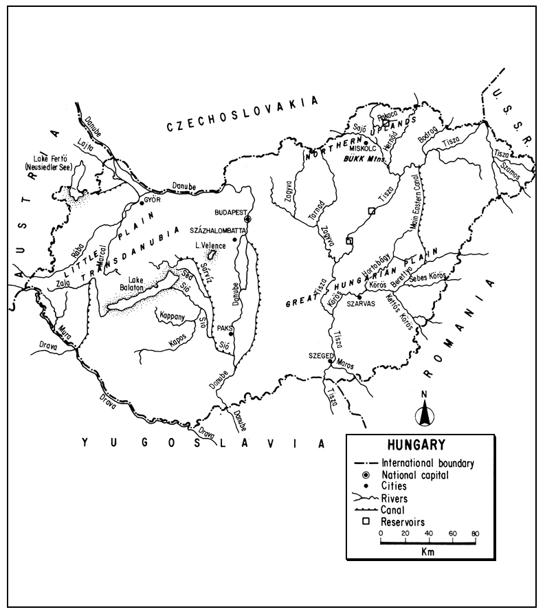 Lying largely within the middle Danubian or Pannonian Basin, Hungary is ringed on the west by the Alps and on the north and east by the Carpathians. The Danube, flowing from north to south, bisects the country into two major regions: (i) the Great Plain or Alföld, a lowland to the east of the Danube and south of the Northern Upland, occupying about 55 percent of the total area, and (ii) Transdanubia, a hillier region west of the Danube, occupying about 40 percent of the country. The Great Plain, a generally level and fertile series of hillocks and sand dunes, the chief agricultural area of Hungary, has a mean elevation of about 90 m. It, in turn, is bisected by the Tisza River which also runs from north to south across the country. Bounded on the west by Alpine foothills, Transdanubia is occupied by hills, low mountains, flatlands and the Lake Balaton Basin. Two other (minor) regions complete the picture: (i) the Little Plain, drained by the Rába and other rivers from Austria, an area of agriculture and swampland in the extreme northwest, and (ii) the Northern Upland, a well-forested volcanic fringe of the Carpathians ranging for 225 km along the Czechoslovakian border, east of the Danube and north of the Great Plain.