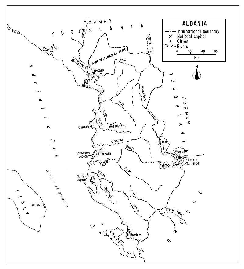 Albania, with a frontier of 1 204 km, is bounded by former Yugoslavia on the north and east for 476 km, Greece on the south and southeast for 256 km, and the Mediterranean Ocean (Adriatic and lonian Seas) on the west for 472 km. About 64 km of its former Yugoslavian border follows river courses; and 65 km of this border is within lakes. With respect to its Greek border, about 19 km are along rivers and 7 km within lakes2.