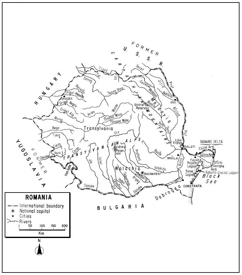 Romania, in southeastern Europe, with strong links to the Balkan region, has a core of high forested mountains, ringed by a zone of hills and plateaux above lowland plains which slope toward the Danube River and its great deltaic debouchement into the Black Sea. Moderately densely populated, this once predominantly agricultural, forested and mining country, has, under controlled economy, developed a burgeoning heavy industry and ever-increasing demands for water.