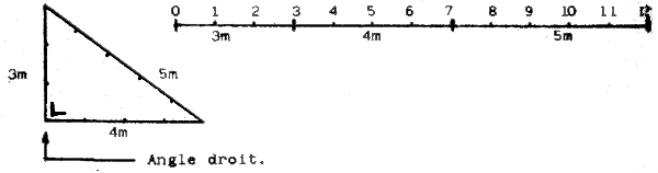 Pour vérifier si deux côtés d'un étang forment un angle droit, il nous faut une corde de douze mètres. Avec cette corde de douze mètres on forme un triangle qui á pour côtés : 3m, 4m et 5m. L'angle formé par les côtés de 3m et de 4m est obligatoirement un angle droit.