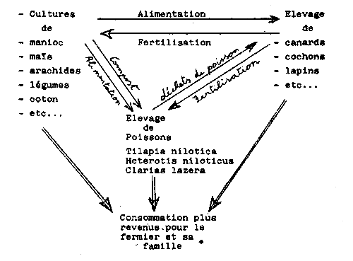 Une méthode pour obtenir de bons rendements est l'élevage associé, dont on parlera plus loin. En fait il y a très peu de gens en République Centrafricaine qui ont comme seul métier la pisciculture. Ce n'est d'ailleurs pas le but recherché. Il faut chercher à intégrer la pisciculture dans la production agricole chaque fois que les circonstances le permettent. Le petit schema ci-dessous vous aidera à comprendre :