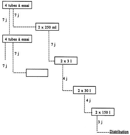 Il consiste à passer progressivement du tube à essai à un volume de 150 à 200. Cela nécessite 25 jours pour obtenir une culture utilisable en élevage larvaire.