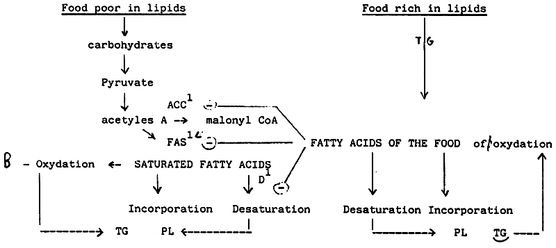 | Principal neosynthetized fatty acids which are incorporated: 16: 0, 18: 0, 18: 1 n-9 | Principal fatty acids of the food which or incorporated: 16: 0, 18: 0, 18: 1n-9, 18: 2n-6, 18: 3n-3, 20: 4n-6, 20: 5n-3, 22: 6n-3, |