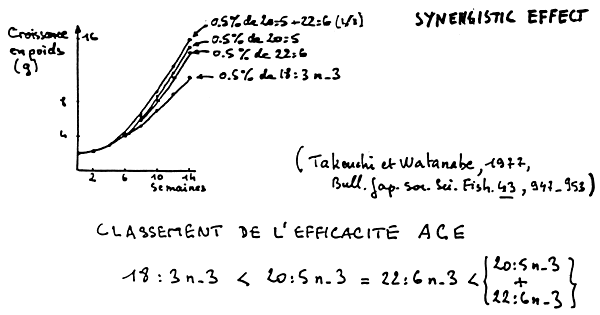 The presence in the food of mixture of P.U.F.A has a favourable effect. All fish cannot be compared with trout (figure 33). The main difference is for the unfavourable effect of linoleic acid. For some marine fish, such as the red sea-bream and turbot, the presence of the precursor of the n-3 series is not efficient because the bioconversion in this fish is impossible, or possible at very low rates The efficiency of the bioconversion is around 1 – 5%.