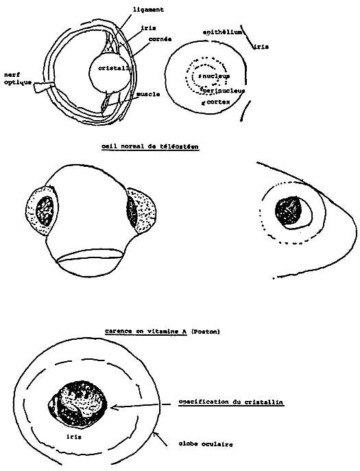 Deficiency in vitamin A provokes characteristic lesions of the eye in salmoneids. As there exist several types of ocular lesions, linked with different deficiencies, we shall with this point alone.