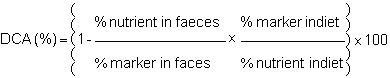The true digestibility coefficient (DCT) takes into account excreted endogenous material such as spent enzymes, mucus, desquamated cells and bacteria. Its formula is: