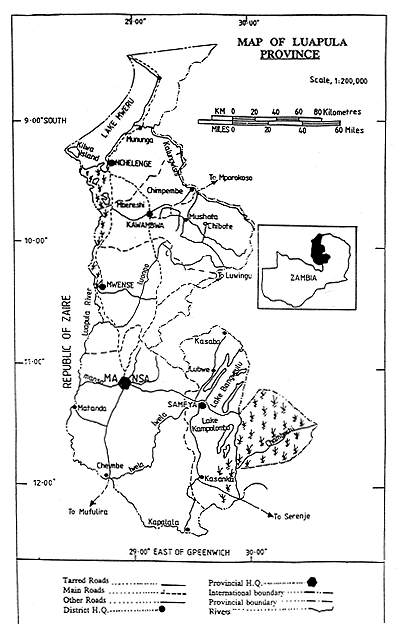 Luapula Province is located between latitudes 8 and 12.4 south and longitudes 28.5 and 30 . It borders Northern Province to the east and Zaire to the west, north and south. The total area is 50,600 km2 distributed as follows :-