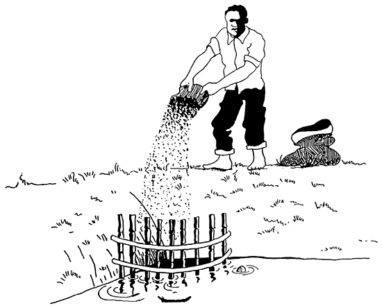 Build a crib with bamboo or other wooden pools in one corner in the deeper part of the pond. This crib will hold the compost you will put in the pond.