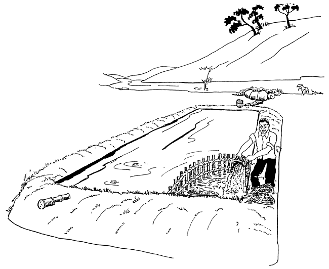 When your pond is filled up, close the ditch so that there is no more water from the stream coming into your pond. You can either do this by putting a big stone, wooden plank or just by heaping mud at the place where the water comes into the ditch.