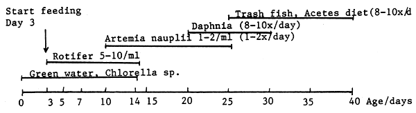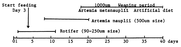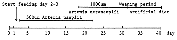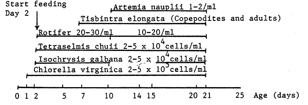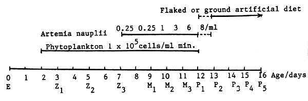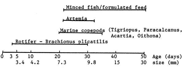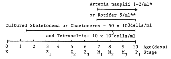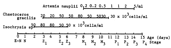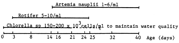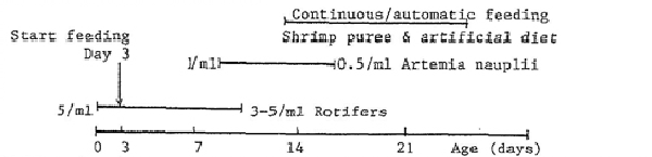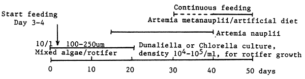 | Source of feeding example cited: Juario et. al., (1985) Temperature 26–30°C. Salinity 34ppt. Larval density 5–125/1. Larval survival 0.7–24.7% (day 35) | |